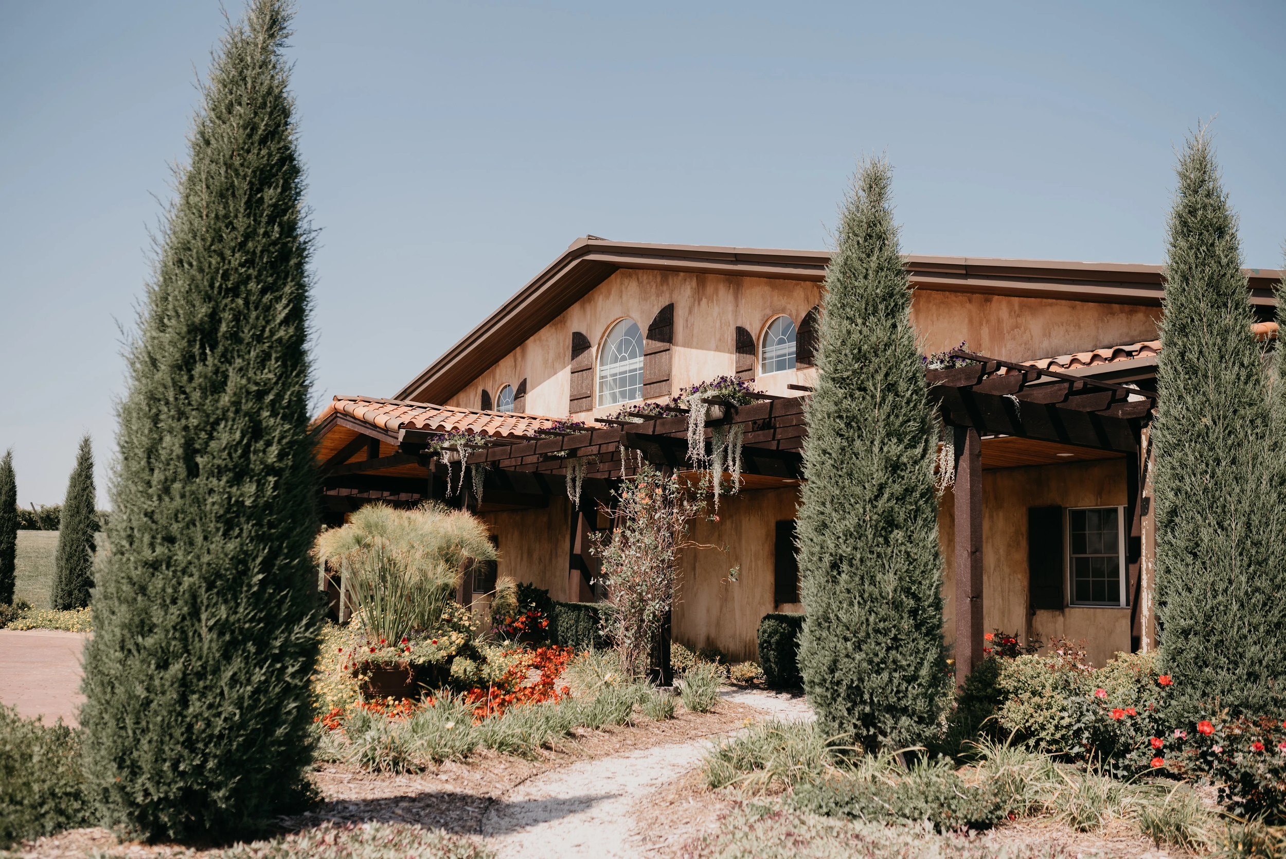 Large Mediterranean-style house with stucco walls, terracotta roof, and wooden pergola. Surrounded by tall cypress trees and colorful garden landscaping.